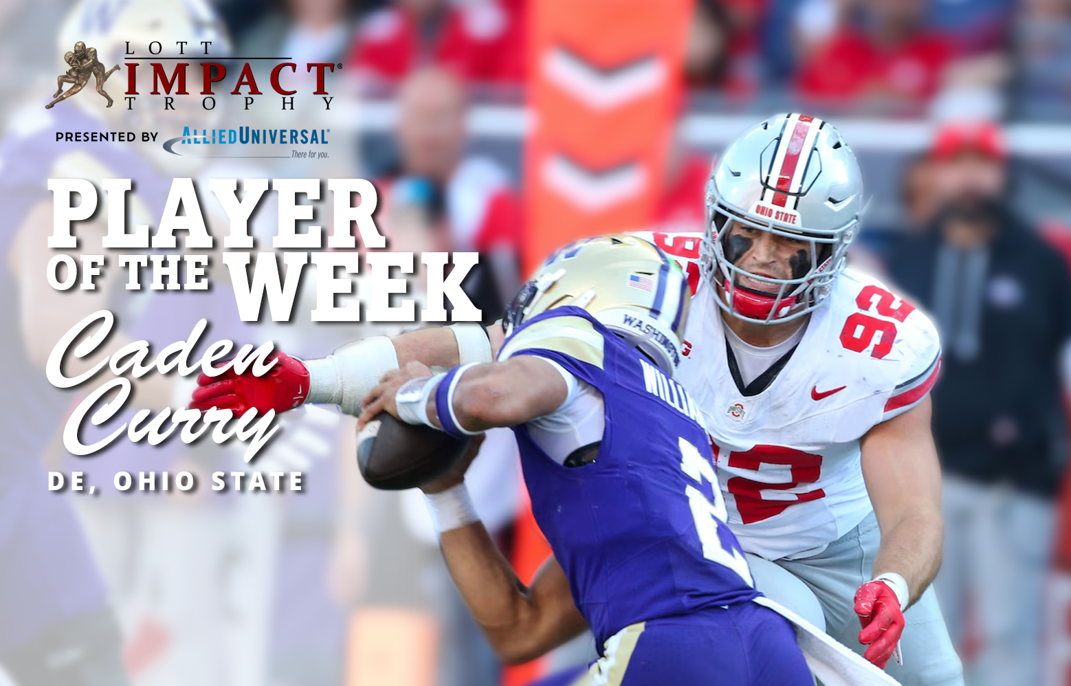NEWPORT BEACH, Calif. — OCt. 1, 2025 — The Lott IMPACT® Trophy presented by Allied Universal®, today announced Ohio State University defensive end Caden Curry has been named Player of the Week for Week 5 of the 2025 college football season.